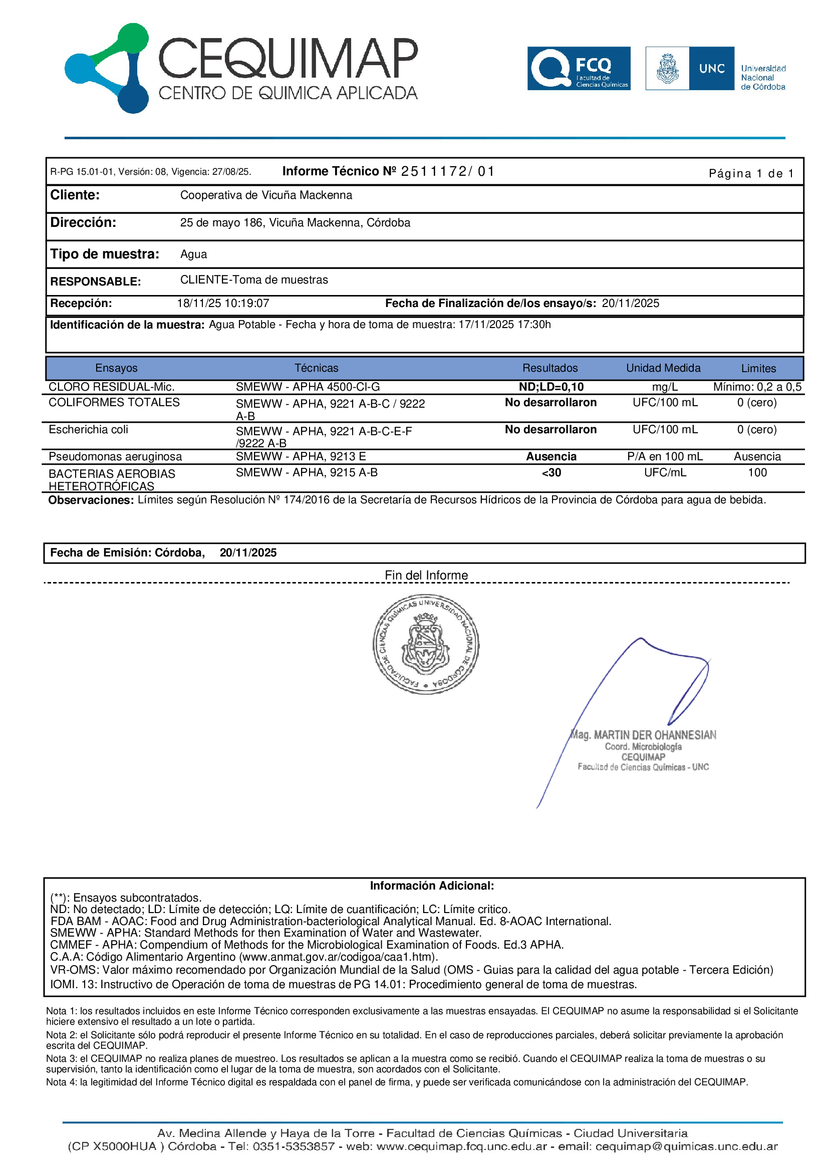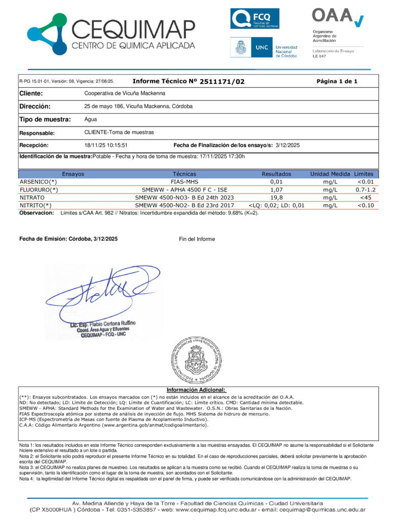 Mensualmente: Análisis bacteriológicos y físico – químicos de Agua Potable y de Uso Higiénico en el Cequimap (Laboratorio de la Facultad de Ciencias Químicas de la ciudad de Córdoba) con muestras tomadas en la salida de cisterna de la planta potabilizadora